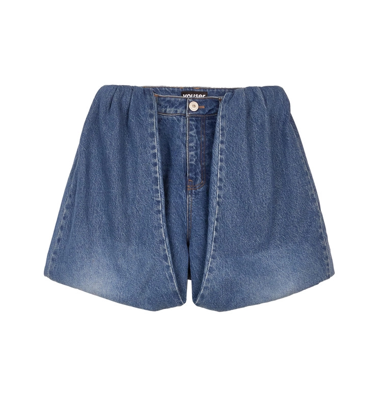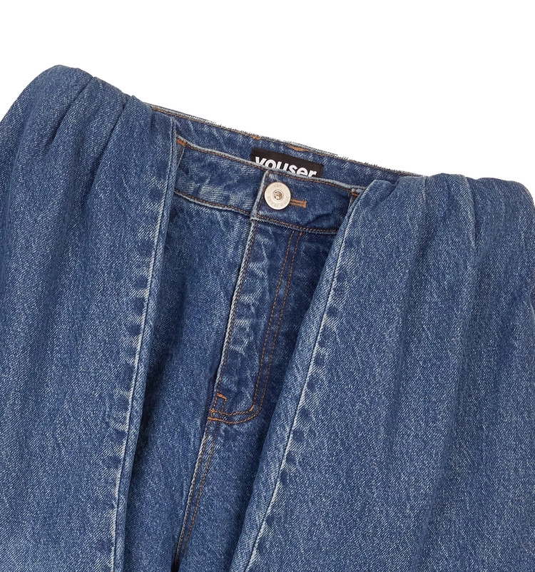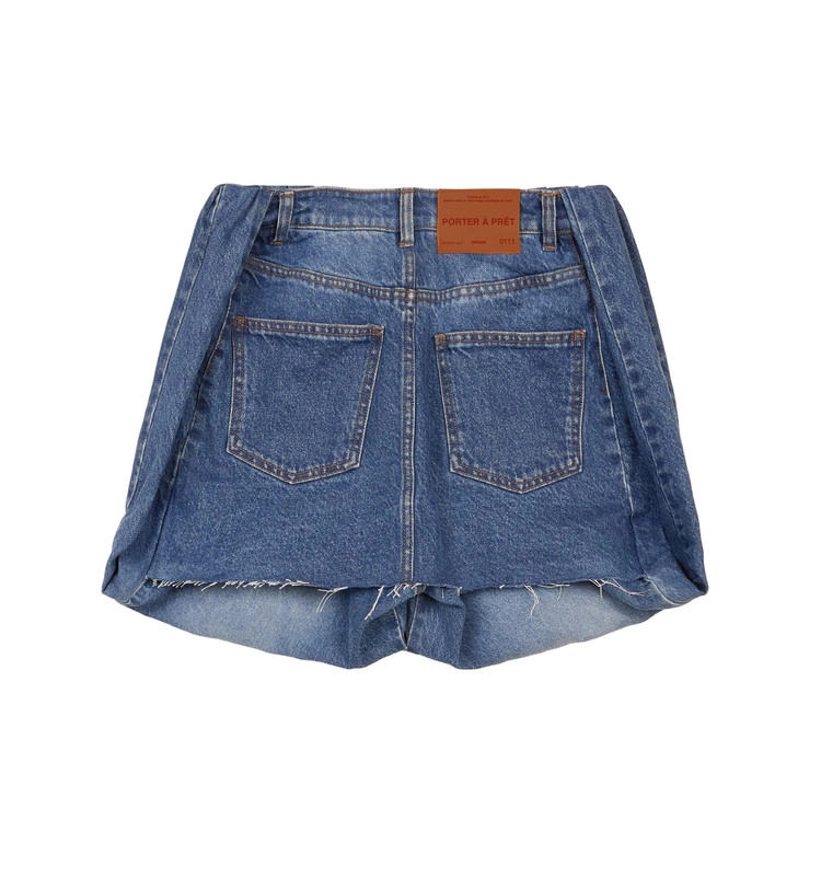 This skirt presents a unique silhouette created by deconstructing and transforming a pair of pants, offering a distinctive design that sets it apart from traditional skirts. The pants' leg openings are lifted and fixed around the waist, creating a voluminous silhouette that exudes a one-of-a-kind charm. The back features a low-cut with horizontal seams, enhancing the skirt's three-dimensional and refined shape.