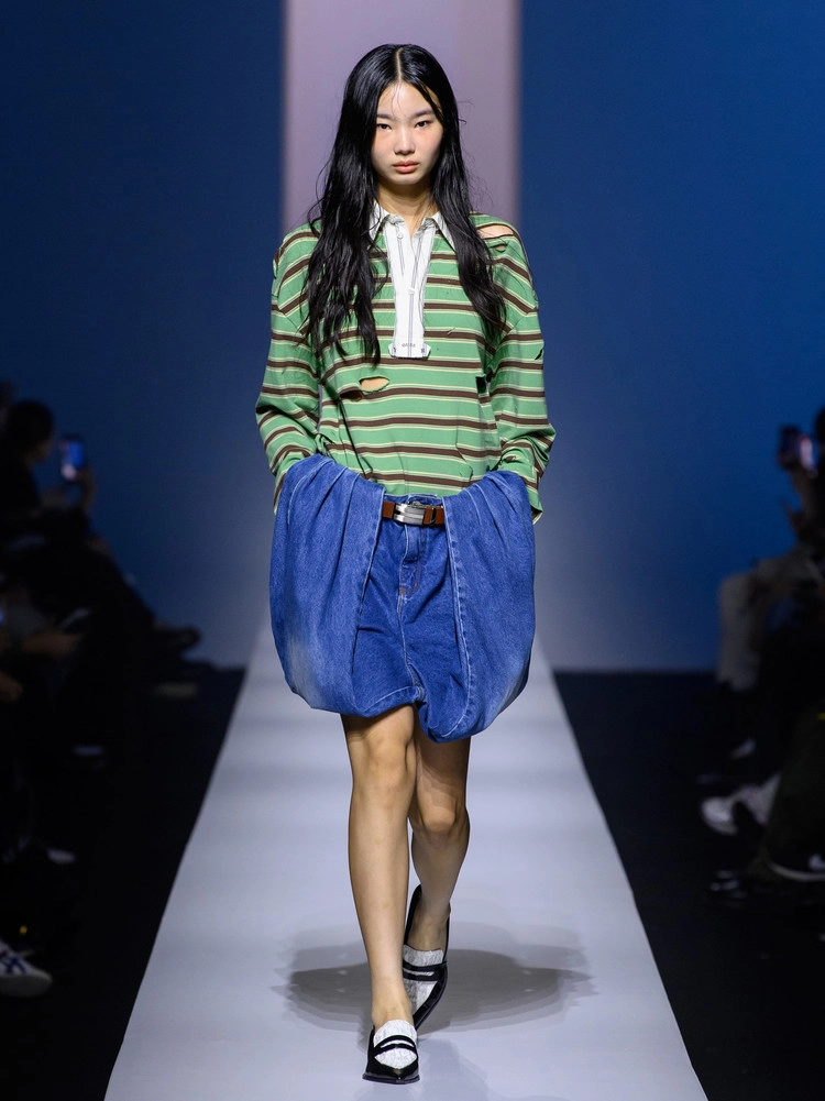 이 스커트는 바지를 해체하여 변형한 독창적인 아이디어로, 기존의 스커트와는 다른 특별한 실루엣을 선보입니다. 바지통이 위쪽으로 올라와 허리 안쪽에 고정되는 독특한 구조를 통해 볼륨감 있는 실루엣을 완성하였으며, 이를 통해 다른 스커트와는 차별화된 매력을 뽐냅니다. 뒷부분에는 로우컷팅을 가미해 가로로 절개선이 들어가 있으며, 이 디테일이 스커트의 형태를 더욱 입체적이고 세련되게 만듭니다.